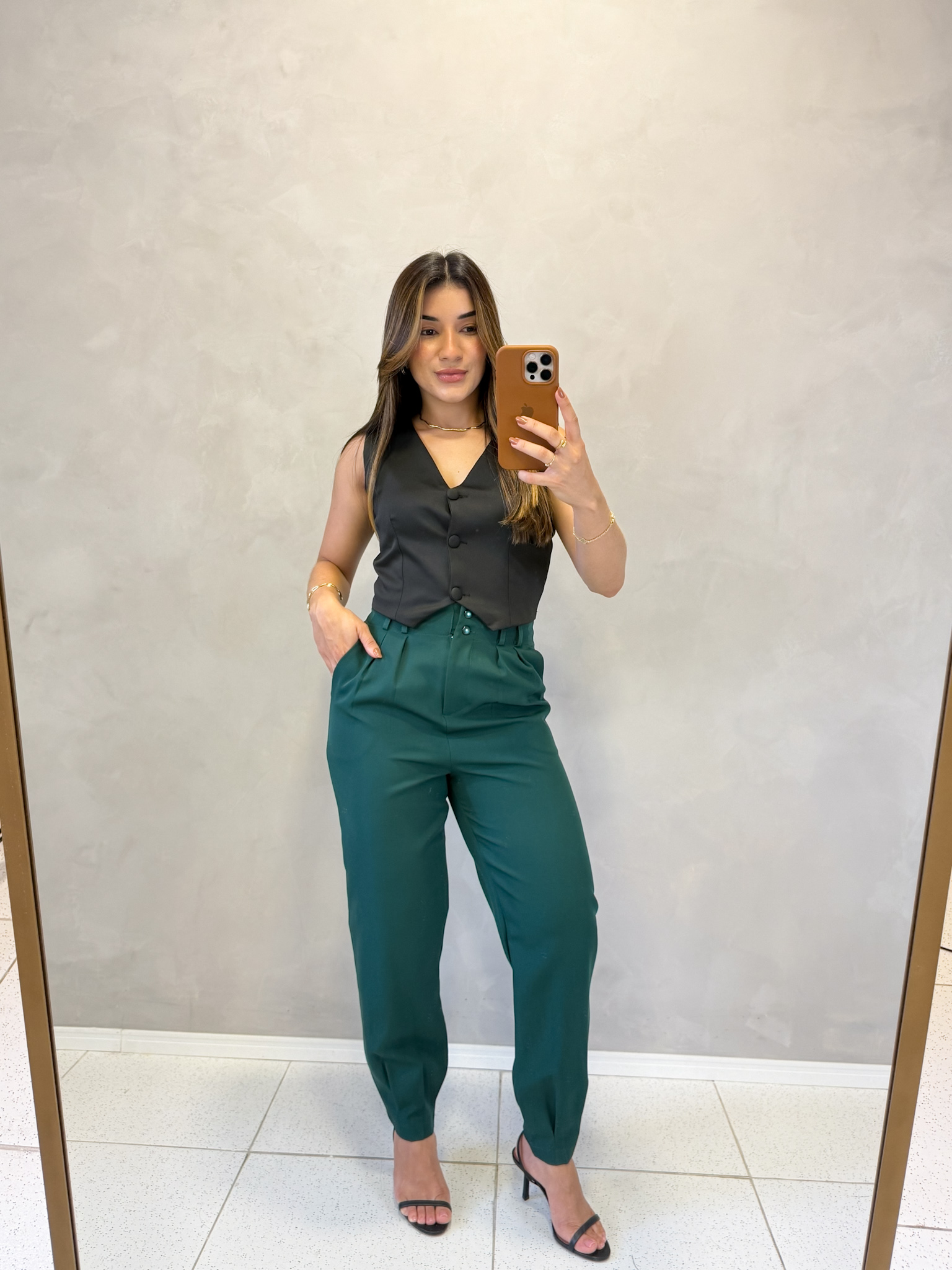Características: modelagem calça cenoura em recorte alfaiataria , fechamento ziper + botão frontal .