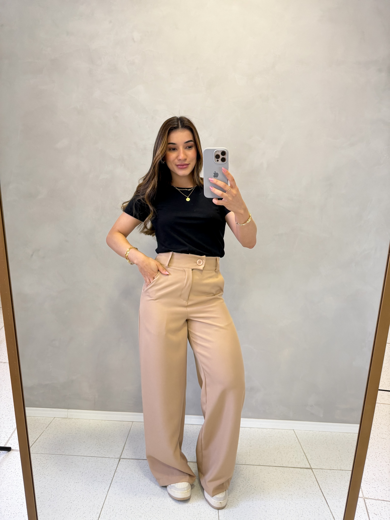 Modelagem Pantalona: coxa soltinha, cintura marcada.