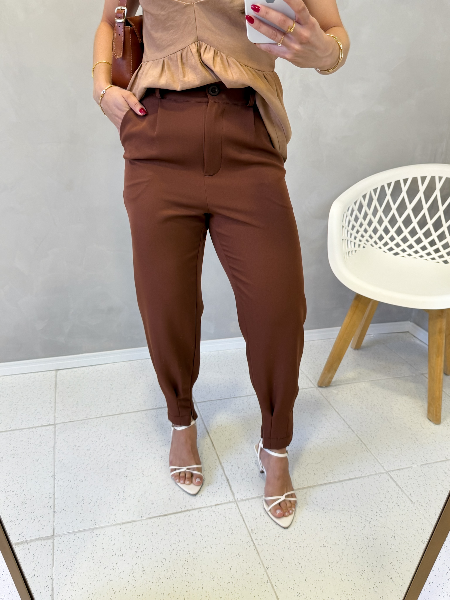 Características: modelagem calça cenoura em recorte alfaiataria , fechamento ziper + botão frontal .